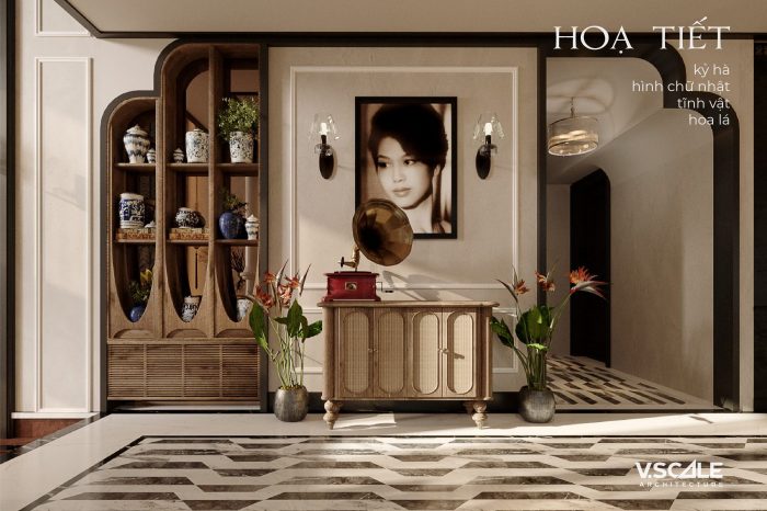 3. Hoạ tiết: hoạ tiết thường sử dụng nhất trong các công trình thiết kế Indochine là hoạ tiết kỷ hà, hoạ tiết hình chữ nhật, tĩnh vật, hoa lá.