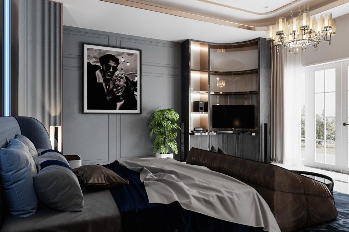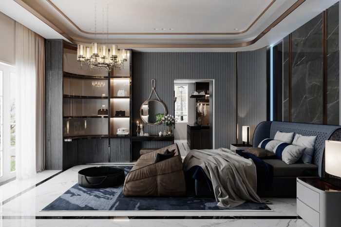 Phòng ngủ master nằm ở tầng 1 với view nhìn thẳng ra vườn, thiết kế phòng master tiêu chuẩn gồm phòng ngủ, phòng thay đồ và nhà tắm – vệ sinh. Tủ trang trí và vách ốp tường được uốn cong nhẹ nhàng ở các góc, chạy theo độ cong của trần tạo độ mềm mại cho không gian phòng ngủ.